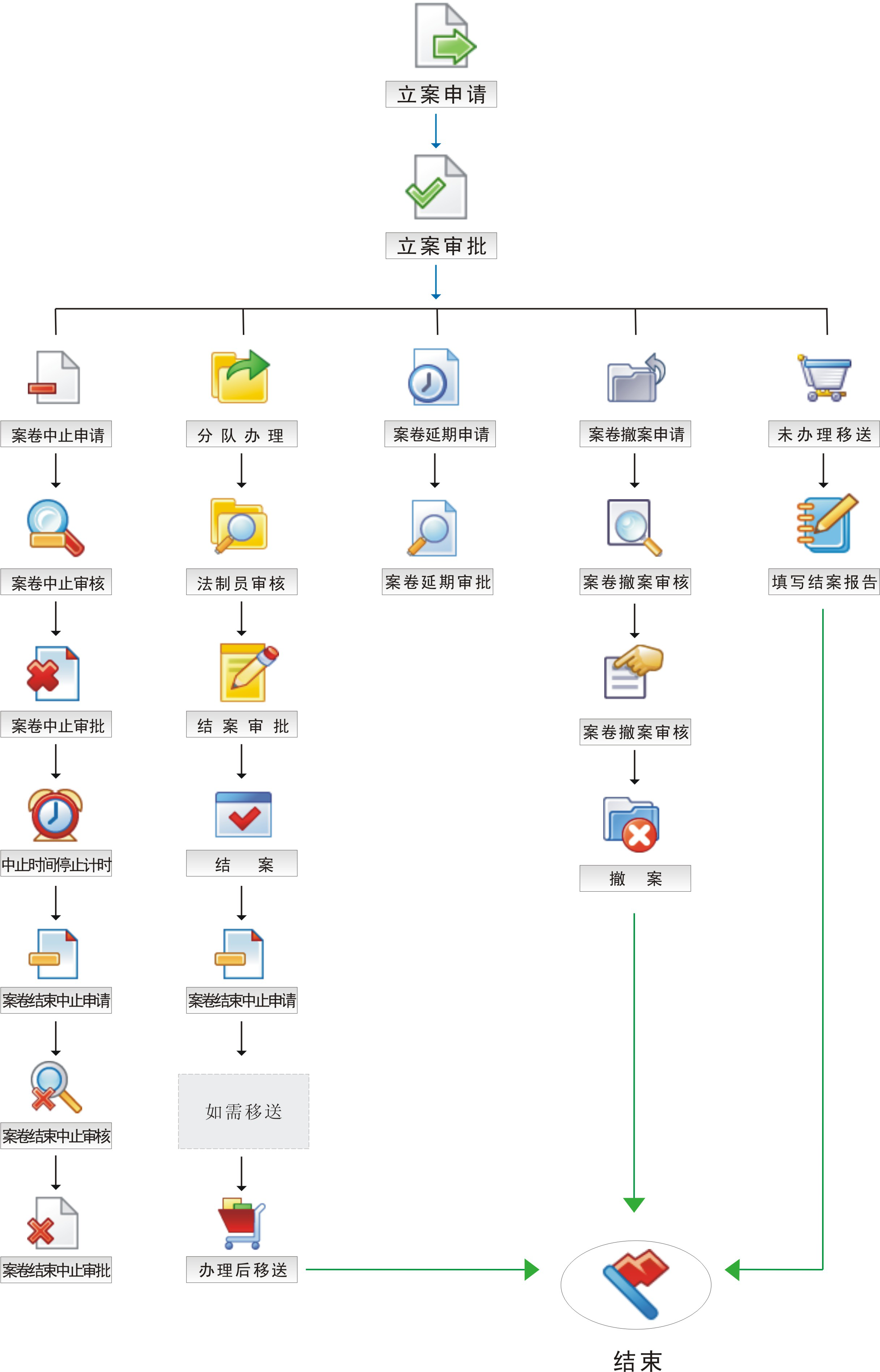 系統将辦案過程抽象為(wèi)數(shù)據模型,通(tōng)過πδ節點進行(xíng)劃分(fēn)為(wèi):立案申請(qǐng)、立案審批、調查<Ω¥β處理(lǐ)、案卷延期與延期審批、案卷中止與φφ案卷結案中止、法制(zhì)員(yuán)審卷、結案← 審批、撤案申請(qǐng)與審批、案卷移送、結案報(b→'ào)告。使得(de)辦案過程全程可(kě)控、透明(míng)可(kě)見(jiàn)。₽×