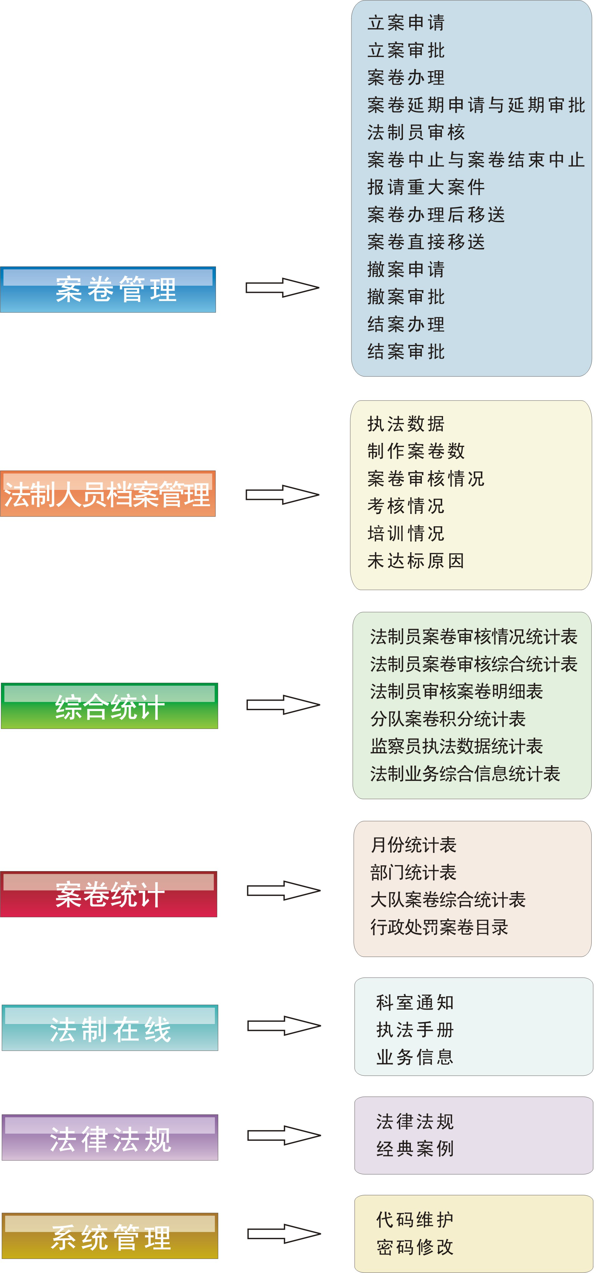 1、進一(yī)步規範了(le)綜合行(xíng)政執法案卷的(de)管理(lǐ),使得₹♥(de)對(duì)案卷的(de)流程管理(lǐ)做(zu ↓§ò)到(dào)各級分(fēn)工(gōng)明(m♠'→λíng)确、全程可(kě)控、狀态跟蹤、便于統計(jì);